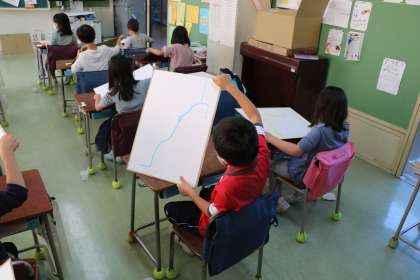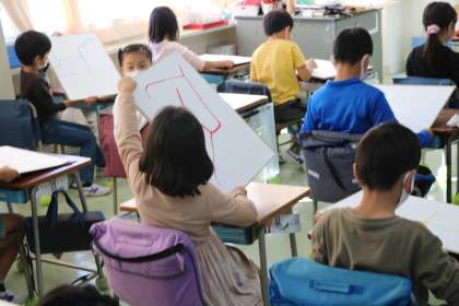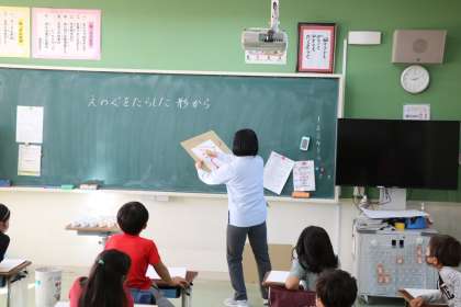 2年生の図工の授業です。今日は「えのぐをたらした形から」というテーマでの作品づくりでした。画用紙にたらした絵具をこぼさないように、両手を上手に使って作品づくりをしていました。