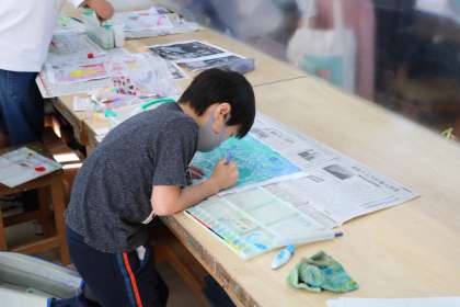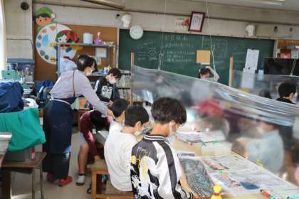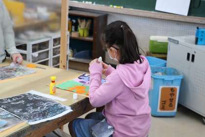 5年生の図工の授業です。「彩色版画」の仕上げを行っています。自分の作品を台紙に貼ったり、名前や題名を書いたりと最後の仕上げ作業を丁寧に行っていました。
