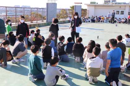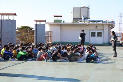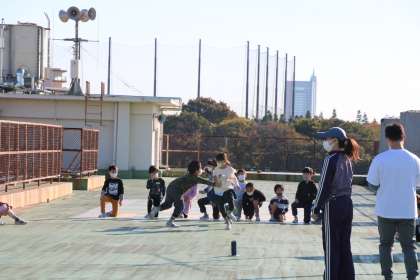 屋上では2年生と5年生が学芸会の練習をしています。限られた練習時間に、子供たちも真剣です。