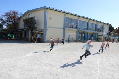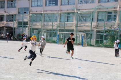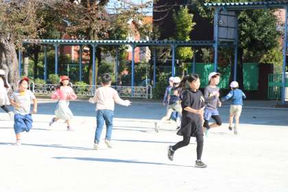 ポカポカ陽気の中、外遊びを楽しむ先生や子どもたちがたくさん見られます。