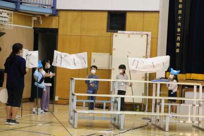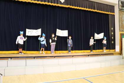 1年生の学芸会始めの言葉担当の子ども達が先生と練習しています。小道具などは練習用のものを使っていますが、練習は真剣に本番同様です。