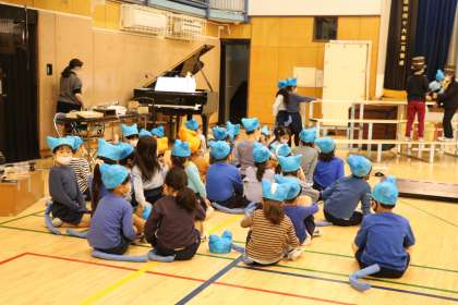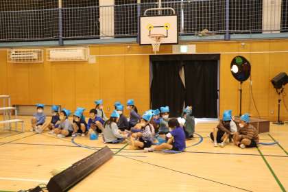 1年生が体育館で最後の練習です。猫耳をかぶる後姿だけでもかわいいのです。