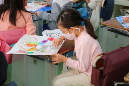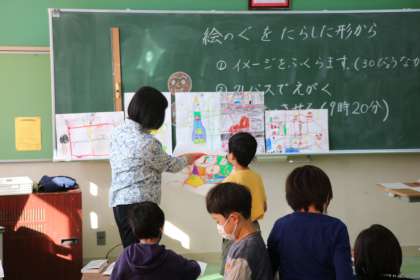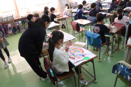2年生の図工の授業です。「絵のぐをたらした形から」というテーマで作品を作っています。絵の具をたらしてできた形から想像を膨らませて、みんな思い思いの作品に仕上げていました。