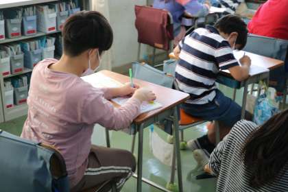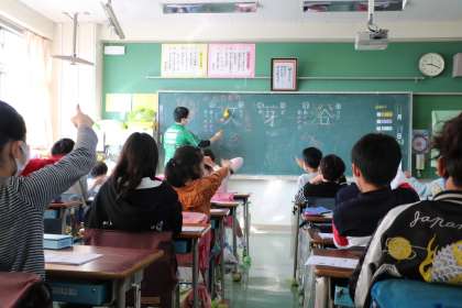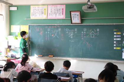 4年生の漢字の授業の様子です。書き順、書き方のポイントを先生が丁寧に解説した後に、みんなで空書きしました。最後に、漢字ドリルにしっかり書いて覚えています。