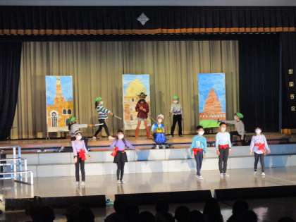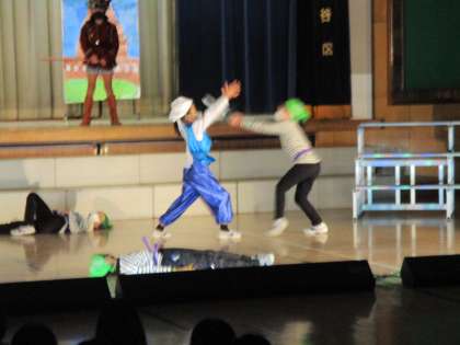 3年生の「七つの海の船乗りラシード」の発表です。舞台いっぱいを使ってたくさんのアクションシーンを演じていました。ばっちり動きが決まっていました。