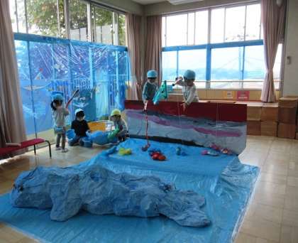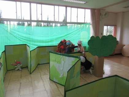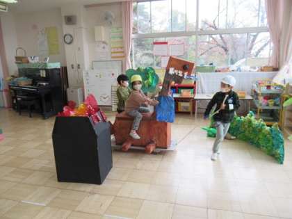 今日は、“わくわくドキドキきぬたランド”で、自分たちが遊んで試す日でした。保護者の方や年少組さんを招待する本番に向けて、係の仕事内容やどんな声掛けをお客さんにしたらよいか確認していました。
