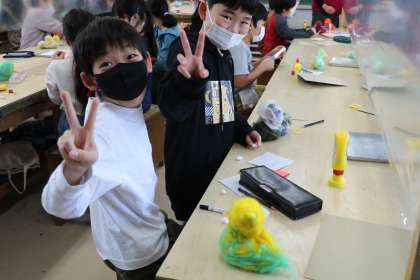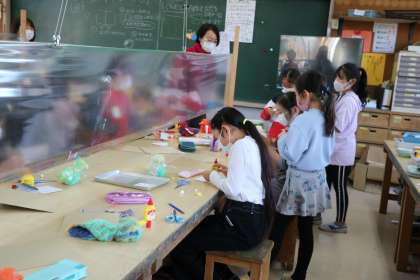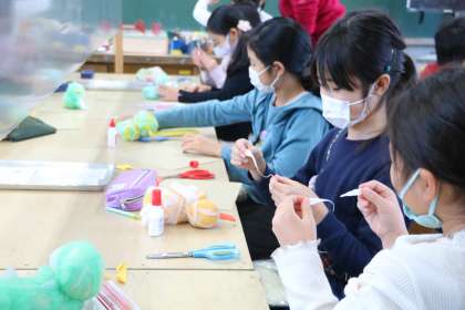 3年生「あったか小鳥」の作品制作の様子です。タオルと輪ゴムで小鳥の体の芯を作りました。カラー原毛を薄く裂いて、たて、よこに少しずつ重ねます。見るからにあったかそうな小鳥です。