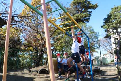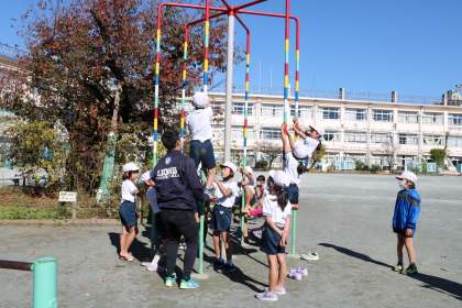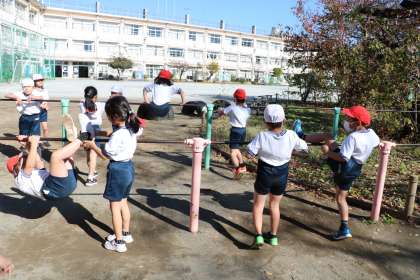 2年生体育の様子です。固定遊具を使って体を動かしています。友達の技を見て「よーし僕もやってみる。」と挑戦したり、「登り棒、青まで登れたから次は黄色にタッチするまで挑戦する。」と目標をもったり、意欲的にがんばっています。