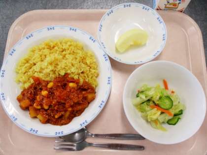 チリビーンズはひき肉と野菜をいためたところに、トマトとチリパウダーを入れて煮込んだ豆料理です。給食ではカレー粉と一緒に炊いたごはんにかけてチリビーンズライスとして出しています。人気のある献立のひとつです。今日はちょうど3年生が大豆の勉強をしていたところだったようで、チリビーンズに大豆が使われているのを知って喜んでいました。