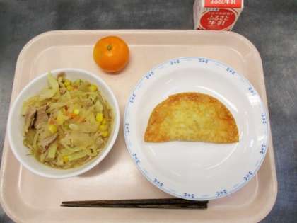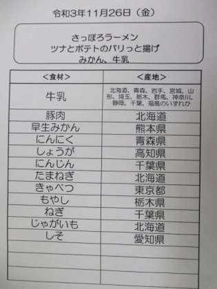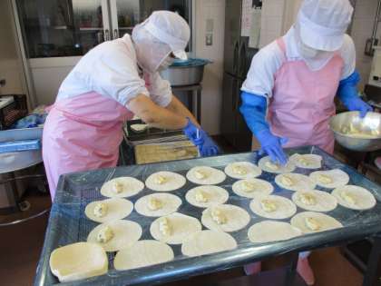 さっぽろラーメンは野菜がたっぷり入ったみそ仕立てのラーメンです。鶏ガラからスープをとって作っています。「おいしかったです!」とたくさんのこどもが声をかけてくれました。写真はツナとポテトのパリッと揚げの調理作業の様子です。餃子の皮の中身には蒸かしてつぶしたじゃがいもにツナ、チーズ、マヨネーズ、しそをまぜたものが入っています。