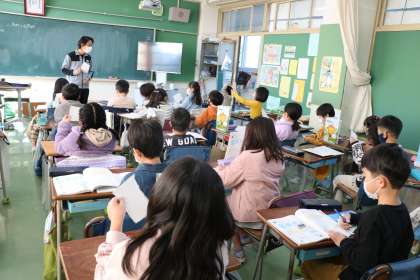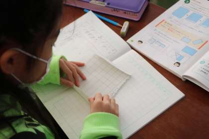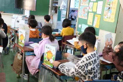 2年生算数の学習の様子です。曲線で囲まれた紙から、直角を作り、四角形を作ります。教科書をよく読み取りながら実際に作っています。先生の説明中に「あ〜わかった、わかった!」と言っていた子も。いざ始めてみると悪戦苦闘、しっかり頭を働かせて考えています。