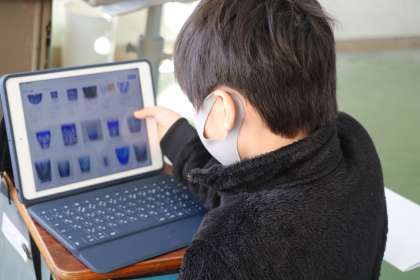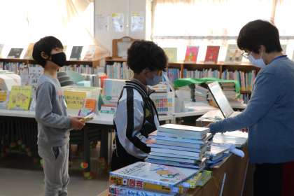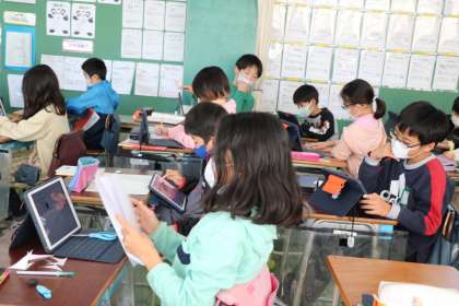 4年生総合の様子です。日本の伝統文化について調べ、興味をもったことについてパンフレットにまとめています。図書室の本を借りて資料にしたり、タブレットで調べたり、ていねいにまとめのパンフレット作りに取り組んでいます。