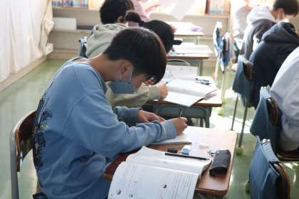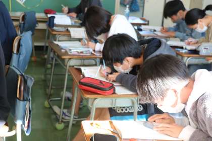 6年生算数の様子です。教科書の三角形の1/2の縮図をノートに書く問題、書けたら先生にチェックしてもらいます。真剣に取り組んでいます!