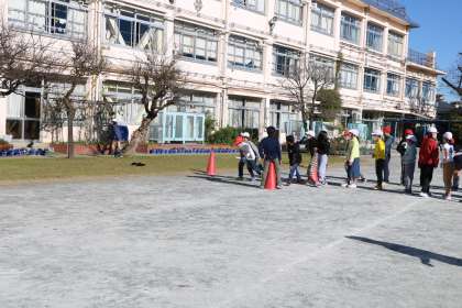 3年生は先生と長縄、4年生はクラスみんなでリレーを楽しんでいます。リレーはこの人ごみの中、上手に校庭1周しています。