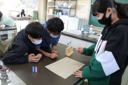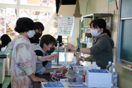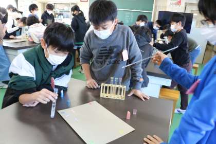 6年生理科「水溶液のなかまわけ」の様子です。リトマス紙に水溶液をたらし、変化の違いから考察します。においの強い薬品や、直接触ると危険な薬品など、子どもたちの興味関心がとても高い学習内容です。真剣に、慎重に実験に取り組んでいます。
