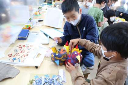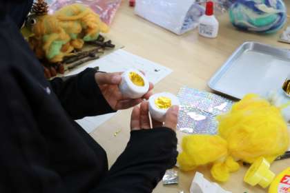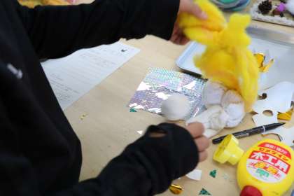 「あったか小鳥」の巣を作ったり飾りを作ったり、楽しそうです。紙粘土を使って卵を作り羽の下で温めているようにした作品を見せてくれました。あったか小鳥もふわふわのゴールドの羽毛、卵の黄身もゴールドです。
