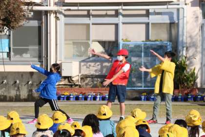 写真は図書委員会の発表の様子です。赤・黄・青レンジャーの3人が司会をし、図書委員会が企画した楽しいイベントについて紹介しています。たくさんの砧っ子が本を読んでくれるように工夫している図書委員です。