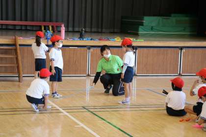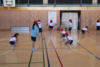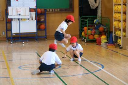 短縄を波に見立てて跳び越える遊びです。みんなタイミングを見計らって上手に跳んでいました。