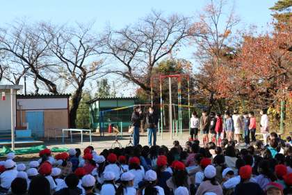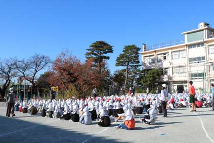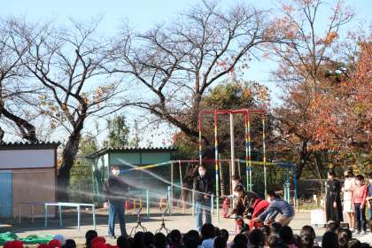 12月の避難訓練が行われました。職員室から出火したという想定で行いました。2学期になって2回目の校庭まで避難でしたが、避難にかかる時間がとても短くなりました。全員が真剣に避難訓練に臨んでいる成果だと思います。今日は区役所の方から初期消火についても教えてもらい、代表児童が実際に消火器を使う体験をしました。