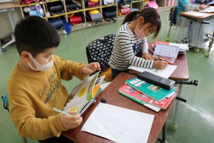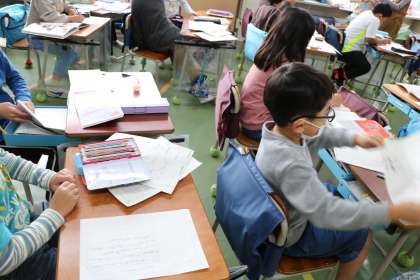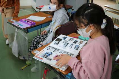 1年生国語の学習の様子です。乗り物に関する図鑑や絵本などたくさんの本を図書館司書の先生準備し、ブックトラックに乗せて1年生教室前においてあります。それら図書資料を使い調べたことを「じどうしゃカード」にまとめています。
