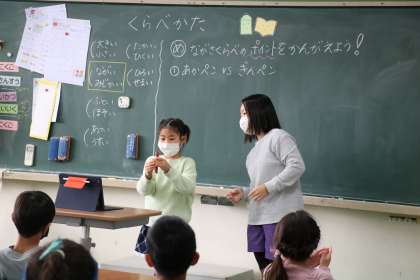 1年生算数「くらべかた」の学習の様子です。今日は長さの比べ方を考えています。どうやって比べればいいか友達の考えを聞き、自分ならどうやるか考えます。またそれを相手にわかりやすく説明することも勉強です。発言している友達の方に顔を向けながら聞く様子は、学習に対する真剣さと同時に、友だちの考えを大切にしようと思うこの学級の温かい雰囲気が伝わります。