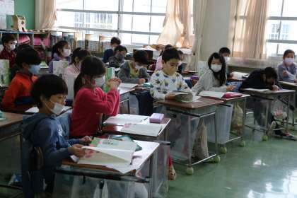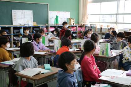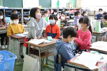 2年生国語「わたしはおねえさん」の学習の様子です。心に残ったところを紹介し合い、友だちの発言を聞きます。自分の考えと比べて様々な考えに気付きます。