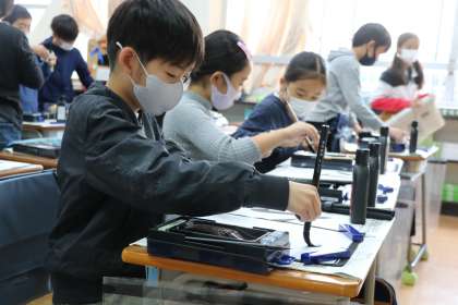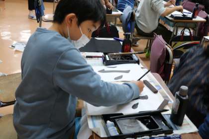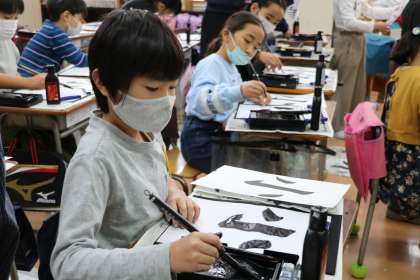 3年生書写の様子です。始筆、終筆に気を付けて筆を運びます。静かな教室に墨の香りが心地いいです。