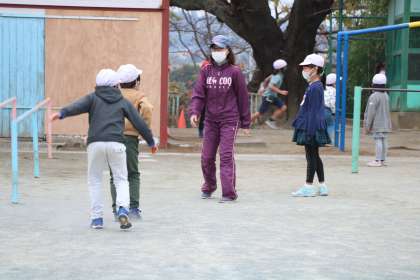 「鬼にタッチされそうになったけど、『今お腹痛いからタイム』って言ったのに、タッチされた。」と言います。女の子が