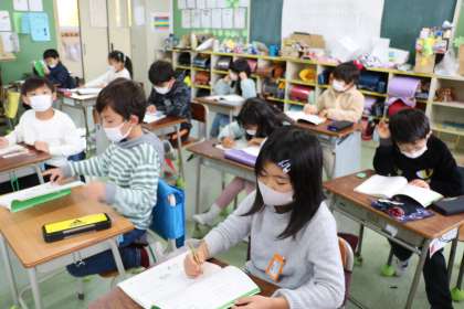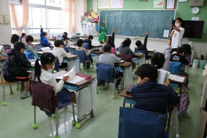 2年生「国語」の学習の様子です。読んで自分が面白いと思ったところに線を引きます。発表するときはその理由もつけて言うと、僕も、私も同じですという子の手が上がります。