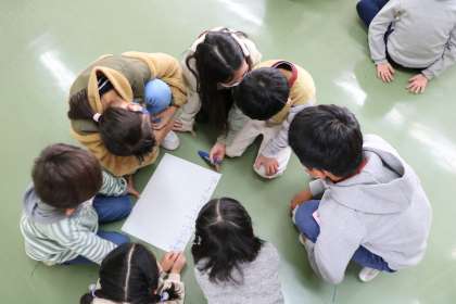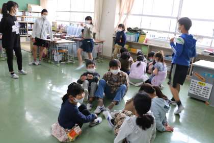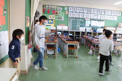 今日の昼休みは2学期最後のなかよし班遊びです。Aグループが教室、Bグループが校庭で遊びます。写真は