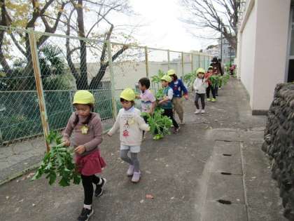 ほし組さんは、大根を掘りに砧小学校の畑へ出発!大きな大根はなかなか抜けず、「抜けなーい」という友達に「大根を揺らして、ぐらぐらにすると抜けるよ」と抜けた子がアドバイス。「本当だ。ぐらぐらにしたら抜けた!なんだか歯みたいだね」と笑い合いました。今年は一人一本(小さめの大根は数本)、持ち帰ることができました。ぜひ、食べてみてください。