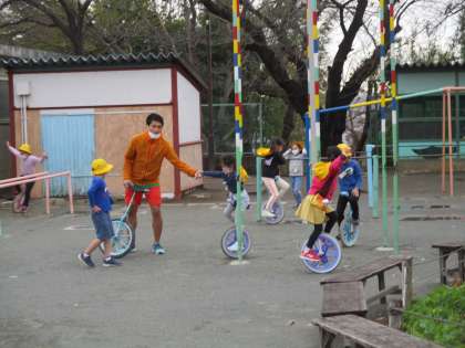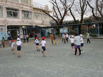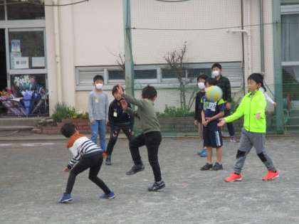 朝遊びの時間です。少し寒い朝ですが、みんな校庭の水たまりを避けて、縄跳びや一輪車、ボール遊びと楽しそうに遊んでいます。