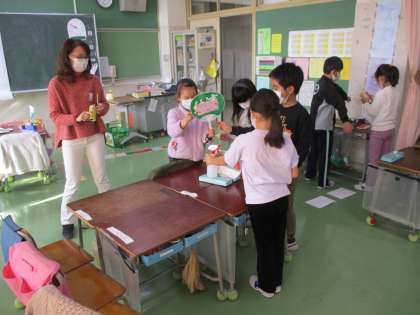 2年生の教室では、「みんなであそぼうまつり」が行われていました。グループで工夫して作ったおもちゃで遊びました。友達が作ったおもちゃで楽しく遊ぶことができました。