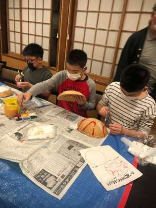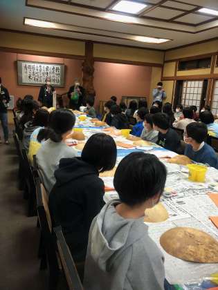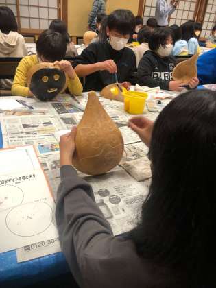 ふくべ細工の様子です。ふくべの果肉を取り除き外皮を乾燥させたものを材料として作られます。ふくべの形を活かして、墨入れや花器、お面などに加工したものです。ふくべとは、夕顔の実をいい、この果肉をむいて干したものがかんぴょうです。