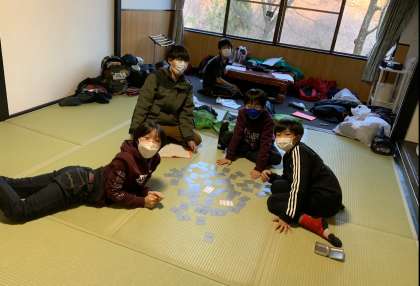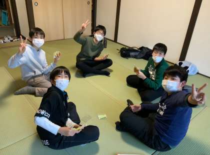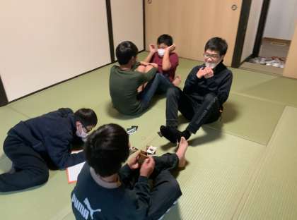 男子の部屋では、カードゲームをしているところ。罰ゲームに筋トレが入るのだそうです。