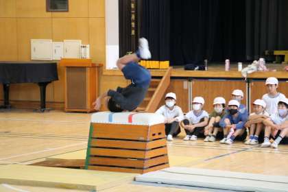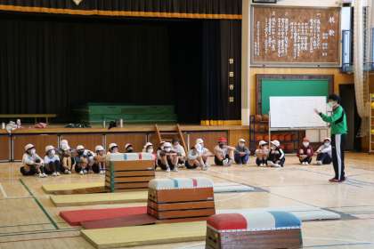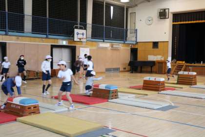 4年生の体育の授業です。先生から台上前転の説明をしっかり聞いて、練習に取り組んでいました。手をつく位置と腰をしっかりあげることがポイントのようです。