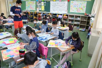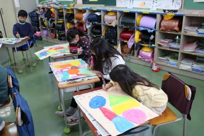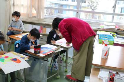 1年生の図工の授業です。「えのぐのつみき」というテーマの作品作りです。今日は絵具で描いた積木にフェルトペンでてんてんの模様をつける作業でした。どの積木も素敵に仕上がっていました。