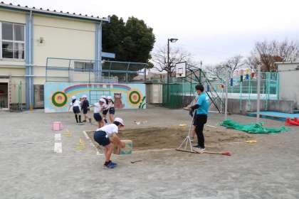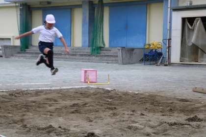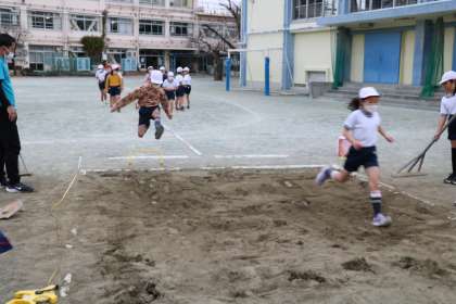 3年生の体育の授業です。雨が降り出す直前で何とか校庭で体育ができました。今日は走り幅跳びの学習でした。高く跳ぶことを意識して何度も練習をしていました。