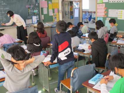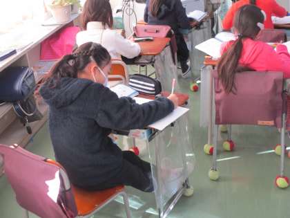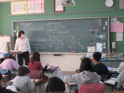 4年生の算数の授業です。「くらべ方、変わり方」について学習しています。この単元は関数につながる大切な単元です。友達の意見を聞きながら板書をノートにまとめていました。