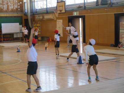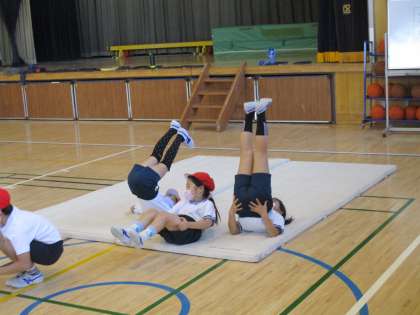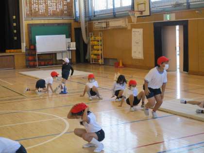 2年生の体育の授業です。マットを使った運動遊びです。どの子も準備運動から楽しく取り組んでいました。
