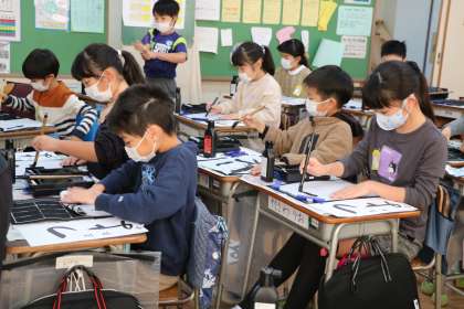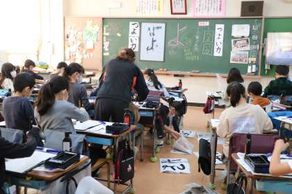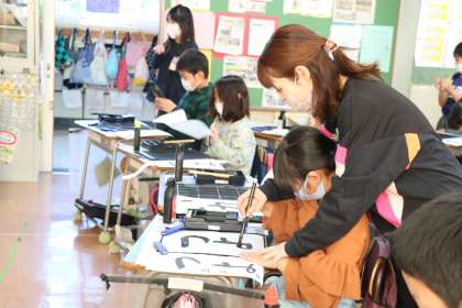 書き初めの練習をしています。今日は始筆と終筆をていねいに、バランスよく名前を書くことをめあてに、半紙に二文字ずつ練習をします。