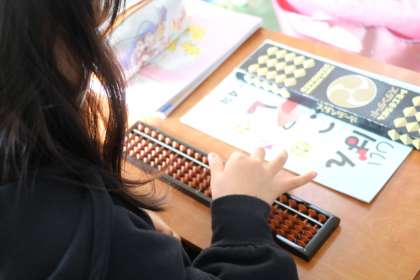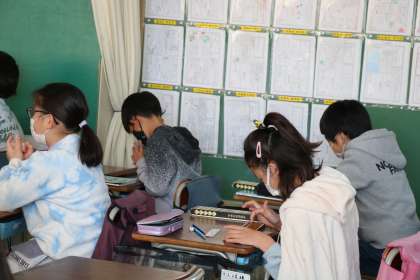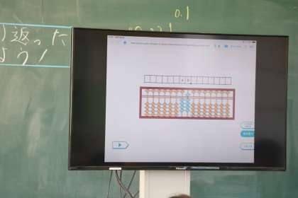 算盤の学習です。電子そろばんを使い先生が説明しています。今はこんな便利な道具もあるのですね。私は巨大そろばんを黒板のさんに置き、授業をしていたことを思い出しました。そんなに昔ではありません。ついこの間までの話です。