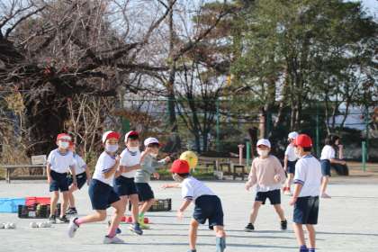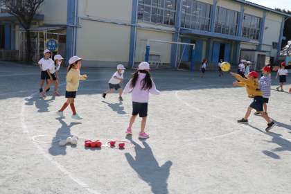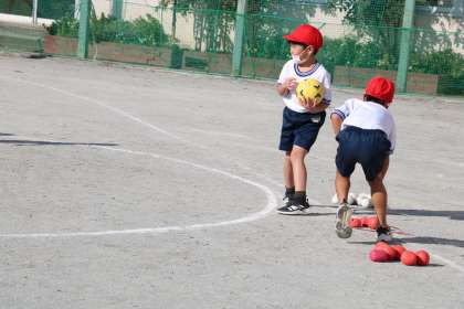 転がしドッチボールです。先攻後攻を決め、輪の中にいるチーム対輪の外にいるチームです。輪の中にいる人にボールが当たったら一点。紅白玉で点数を表します。
