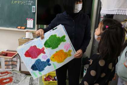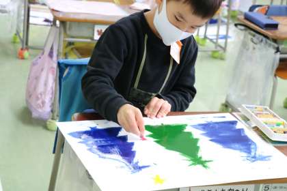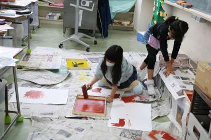 2年生が版画の摺りに挑戦です。ハサミで形を作れるプラスチック素材の版です。1色摺ったら版を洗い、また別の色で摺ることもできます。