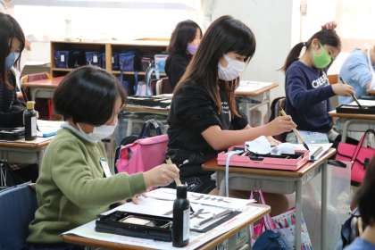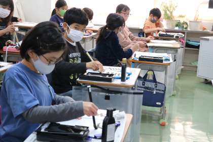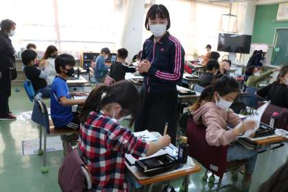 書初め「美しい空」の練習です。漢字の中心がそろうようにすると、全体が整うということで、「字の中心」を意識して練習しています。