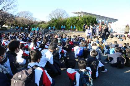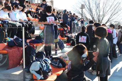 大蔵総合運動公園噴水前で集合です。検温等体調チェックを済ませてスタジアムにないります。ゼッケンを付けたり、たすき、はちまきを受け取り気持ちも盛り上がってきます。