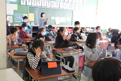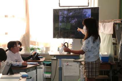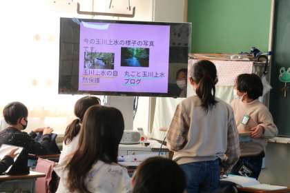 4年生社会調べ学習の発表の様子です。スライドにまとめたことを発表しています。絵や写真、要点を書いた文章など、発表の様子もそれぞれ工夫しています。