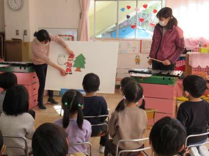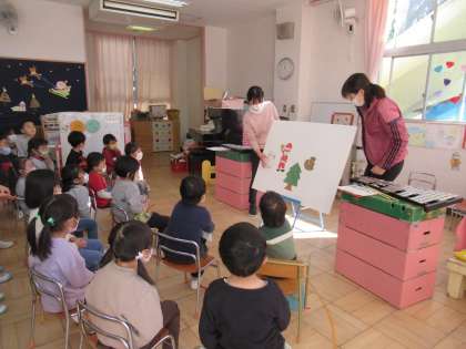 はな組さんみんなで集まって、クリスマスのパネルシアターを見ました。鉄琴の音色とともにお話が進み、素敵な音色にうっとりしながらじっとよく見ていました。