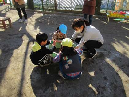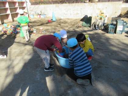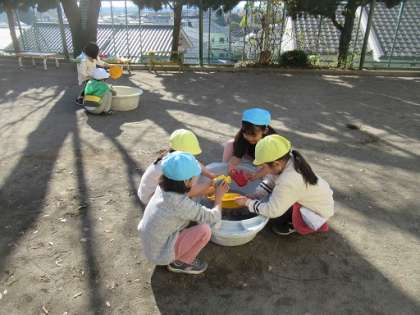 もうすぐ2学期も終わり。たくさん使った砂場の遊具を、ほし組さんがきれいに洗って片付けてくれました。「ほし組さん、何してるの?」というはな組さんに「もうすぐ冬休みだからきれいにして片付けるの」と答えていました。「ほし組さーん、ありがとう!」とはな組さんが声をかけてくれたので、さらに張り切ってどんどん洗ってピカピカにしていました。