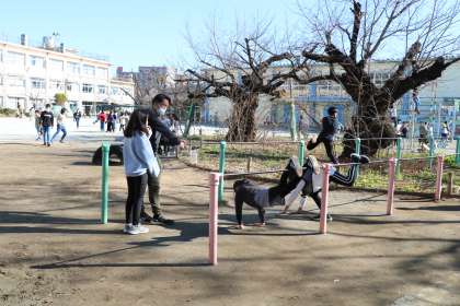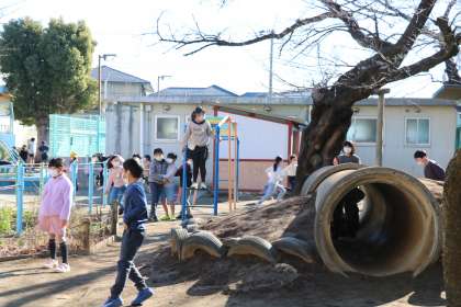 幼稚園から帰ってきたらちょうど休み時間です。土管に入って遊んだり、先生とゴム跳びをしたり、ほのぼのする光景に嬉しくなりました。